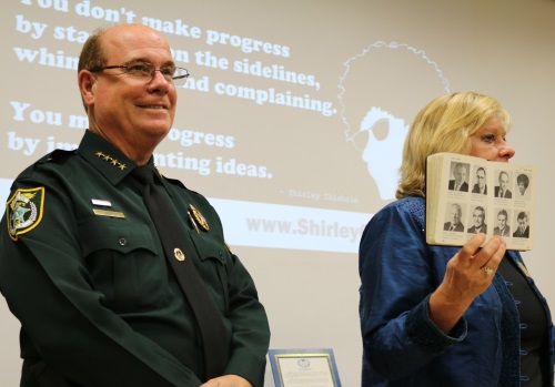 Walking into Office Divvy's COWORK, where the event was hosted, a warm and inviting atmosphere was present. People from all walks of life came together to pay tribute to the deserving Shirley Chisholm. There were light snacks, drinks, and a large birthday cake with the iconic illustration of Chisholm used in the #IKnowNow campaign. As the audience settled in, Orjanette Bryant, CEO of Natural Nubian, kicked off the event by introducing a few speakers. Jim Manfre, Flagler County Sheriff, was one of the first to speak, alongside his wife Cornelia, about how they supported Chisholm's journey, holding a Congressional Pictorial Directory from 1975, which had a page with Shirley Chishom on it, signed by Ms. Chisholm herself.